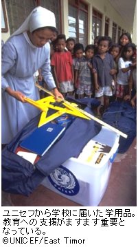 このように東ティモールの国造りはまだたくさんの課題が残されているものの着実に前進しています。ユニセフは特に人間と国の安全保障に向け、基礎教育に力を入れています。基礎教育の内容充実のためにも、カリキュラム作成、教科書づくり、教員の訓練などの支援に積極的に取り組んでいます。なかでも学校のデータシステム作りを行ない、全国のネットワーク作りに貢献したことは、非常に成果がありました。ユニセフの初等教育支援に対する期待が更に高まっています。