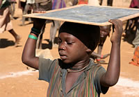 | ウガンダ北東部のモロト地区ナマトワエの「アベクセンター」での勉強を終え、ノート代わりの小さな黒板を頭に載せて帰る子ども。 |