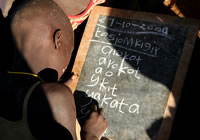 小さな女の子が、農家から小さな黒板を抱えてアベクセンターに通っています。この女の子は、“教室”の最前列で、その小さな黒板を木に立掛けて勉強していました。他の二人の子どもたちは、小さな黒板とチョークが入った箱を抱えています。この箱は、この“学校”で子どもたちに配られることになっています。
