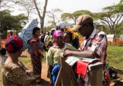 | ウガンダのルワムワンジャ難民キャンプで難民登録を受けるコンゴ民主共和国から避難を余儀なくされた人々。トランジットセンターで集められた保護者のいない子どもの情報と写真は、モバイルアプリケーションを利用して、キャンプ地に点在しているスタッフに届けられる。子どもが難民キャンプ地に到着する前に、子どもの家族の捜索は開始されている。 |