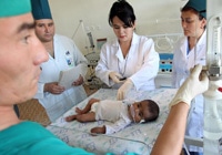 | ウズベキスタンのアンディジャンにある病院で、ユニセフが支援したタイマーを使って、マイルダちゃん(生後3ヵ月)の心拍数を計る医師。ここの病院のスタッフは、子どもの生存を改善しているIMCIプログラムの一環として研修を受けた。 |