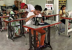 | ユニセフが支援している学校で裁縫を学ぶ子どもたち。この学校は、障害のある子どもたちが安全に遊んだり、新しい技術を学んだりしている。 |