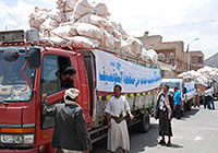| 避難を強いられた人々のため、ハッジャーに向かうトラックに満載された支援物資。 |
