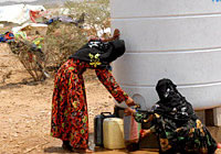 | 避難民キャンプに設置された給水所で飲料水携行用ポリタンクに水を汲むサアダ北部から避難してきた女性。イエメン北部で続く武力紛争で、多くの市民が影響を受けています。 |