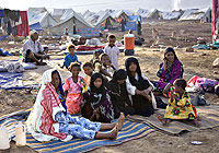 | イエメン・ハッジャのハラド地区にあるアル・マズラク避難キャンプの入り口で、支援物資の配給を待つ人々。イエメンでは、サアダで武力衝突が始まった2004年以降、約17万5,000人もの人々が、こうした避難生活を余儀なくされています。 |