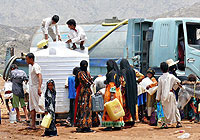 | ユニセフが、アル・マズラク避難キャンプ内20箇所に設置した給水タンクから水を汲む人々。この地域では、続く武力衝突の影響で、約500世帯が避難を強いられました。 |
