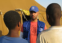| イエメンで、IOMのスタッフに、母国帰還支援の説明を聞くエチオピア出身のハッサンさんとモハメッドさん。 |