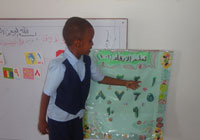 | バサティーン地区の保育センターでの授業の一風景:クラスメートにアラビア数字を教えている男の子。 |