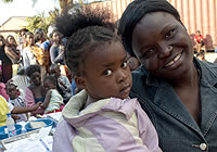 | 全国はしか予防接種キャンペーン期間中、ザンビアの首都ルサカにある診療所で予防接種を受けるために並ぶカセコちゃん(3歳)と叔母のサラさん。 |