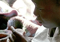 | ザンビアのルサカにあるチャワマはしか病院で、薬を飲むはしかに感染した子ども。 |