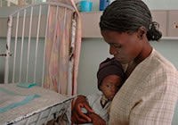 | 深刻な栄養不良のために、ハラレの病院で治療を受けている2歳の子どもとその母親。栄養不良などが原因で体力や抵抗力のない子どもたちがコレラなどの感染症の犠牲になりやすくなっている。ユニセフは、栄養補助食品の配布、保健員の研修などを行っている。 |