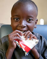 | 現在、ジンバブエはさまざまな混乱を抱えており、保健サービス、教育などにもその影響が現れ、子どもたちへの直接的・間接的影響が懸念されている。写真は、深刻な栄養不良に苦しむ女の子。すぐに食べられる栄養補助食品のひとつPlumpy’nuts®=プランピー・ナッツを食べ、現在順調に回復している。 |