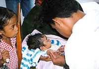 99年の騒乱により保健施設の77%が破壊され、東ティモールの医師135人のうち20人だけが東ティモールに残りました。東ティモールの保健事情は世界で最も遅れた地域の一つで、乳児死亡率は1000人当たり85人に達します。ユニセフは危機に対応するため、1999年10月〜12月に保健・栄養関連の援助物資を配布し、2000年には支援の重点を緊急救援から復興に移し、1)中央薬局と中央試験所の再建、2)予防接種、3)妊産婦の保健、4)栄養、等の分野において主導的役割を果たしました。
