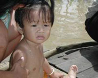 ユニセフは抵抗力の弱い乳幼児をコレラなどの感染症や下痢から守るために、医療器具、医薬品、下痢による脱水症を防ぐ経口補水塩(ORS)を配布するとともに、迅速な医療活動を支援するため、被災地域の保健所に移動用ボートの提供を行っています。また、保健所修復のための資材提供、ビタミンAカプセルの補給、予防接種の実施など、被災地域の子どもの健康を守るための活動を実施しています。