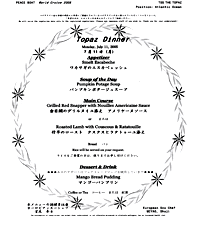 そしてお客様に配布するメニューの一部に、「本日のデザートはフェアトレード商品を使っています。」という一文を入れて、お客様にご案内しました。また、実際マンゴプディングの味がどうか、メニューの内容がどうか、こういったことに関心があるかなどアンケートを取るなどし、今後の方針の参考にさせていただいております。実はこの日は船が若干揺れており、シェフも食べに来ていただけるか不安もあったのですが、宣伝効果もあり、多くの方に食事を召し上がっていただくことになりました。