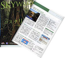 次に、日本航空のスカイワードという機内雑誌の146ページに、(コードプロジェクトを推進する)JALグループのはっきりとしたメッセージが掲載されております。このスカイワードは、1カ月50万部刷っています。ご存知のように飛行機の中では何かと暇なものですから、この機内誌も非常に有効なツールです。実は、最初に全日空の機内誌「翼の王国」でこのコードプロジェクトのお話を掲載してくださるという発表があり、その後すぐに日本航空の広報部に連絡しました。そこで、私どもJALパック等の案内が掲載されている旅行案内ページに旅行観光産業の健全なる発展を目指してというコラムを設けました。
