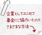 - 「お酒」「たばこ」「武器」「ギャンブル」「アダルト関連」「母乳代替品」「石油、石炭、天然ガス」に関連する企業・団体からのご寄付(団体賛助会費を含む)、また、ユニセフの使命および子どもの利益と相容れないとユニセフおよび当協会が判断した場合のご寄付は、辞退させていただく場合があります。