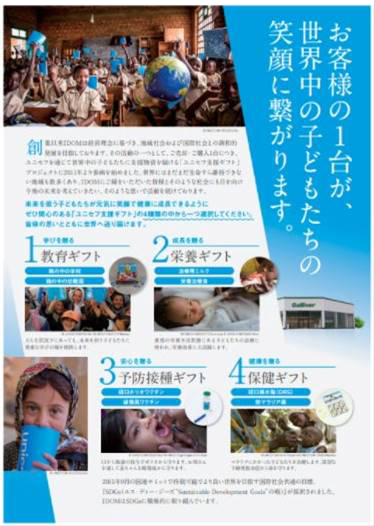 ガリバーでは、中古車の買取・販売の契約時に営業スタッフがお客様に説明をしながら、一緒に支援物資を選ぶことができるため、途上国の実態について理解を深める機会にもなり、支援活動に協力している実感が持てるということで、「ユニセフ支援ギフト」プロジェクトの導入を決定いたしました。