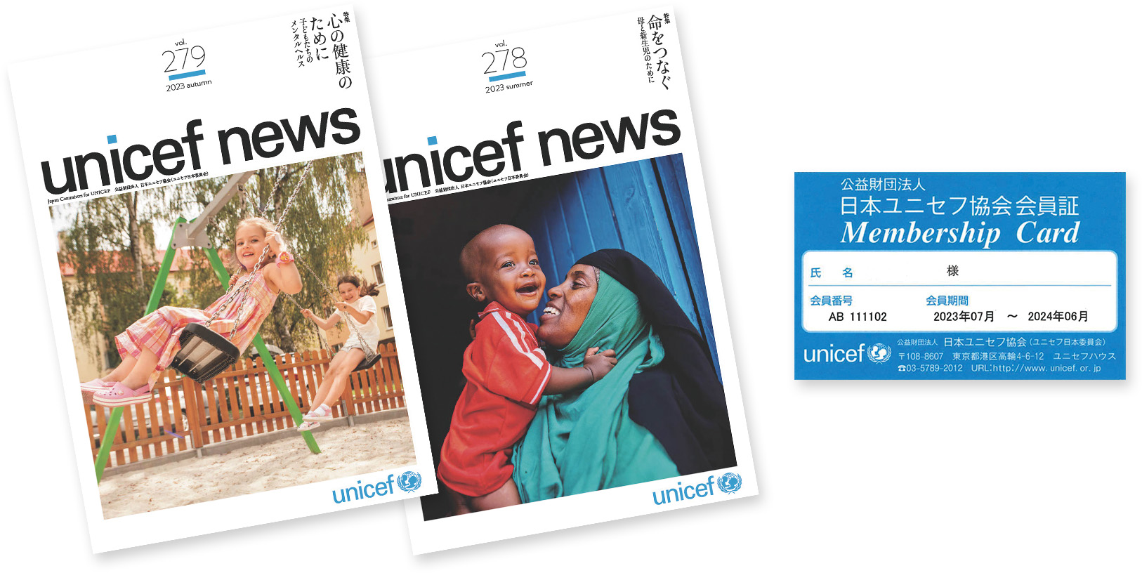 世界の子どもたちの状況とユニセフの最新情報、国内活動のお知らせなどを紹介する広報誌「ユニセフニュース」(年4回発行)をお送りします。 また日本ユニセフ協会および協定地域組織が行う写真展やシンポジウム、チャリティバザーなどイベントのご案内をお送りします。