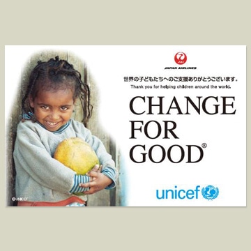 日本航空の国際線(コードシェア便を除く全路線)や国内線では、ユニセフ外国コイン募金へのご協力を呼びかけています。機内に用意されている封筒「Change for Good®(チェンジフォーグッド)」に入れて、客室乗務員にお渡しください。