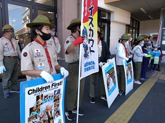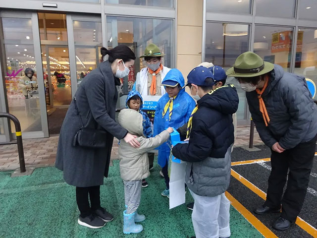 天候に恵まれた暖かい日に募金活動ができよかったです。久しぶりの募金活動で参加したスカウトと成人が一生懸命声掛けをしてくれ、多くの募金が集まりました。朝早くから人出が多く、たくさんの方々が募金に協力してくださり、子供に「がんばって」と声をかけてくれる方もあって、大変うれしかったです。師走の駅前で、大道芸や署名活動などにぎやかでしたが、人の役に立てているという幸せを感じながら活動できました。