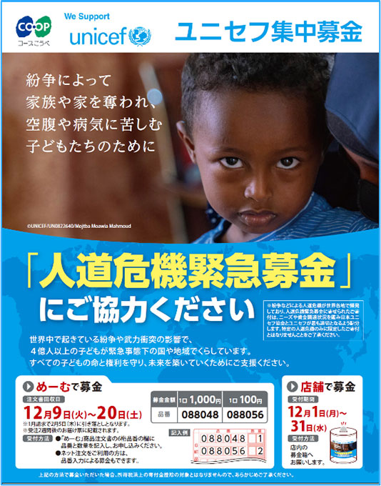 現在、全国の多くの生協が多様なユニセフ活動に取り組んでいます。 組合員は毎週の注文用紙で募金を申し込めるほか、多くのコープの店舗にユニセフ募金箱が設置されています。バザーやカレンダー募金を実施したり、年末のユニセフ・ハンド・イン・ハンド募金に参加したり、組合員やスタッフがボランティアとして店舗や街頭での募金活動に取り組んでいます。さらに、商品の売り上げの一部を募金として特定の国のプロジェクトを支援している例もあります。