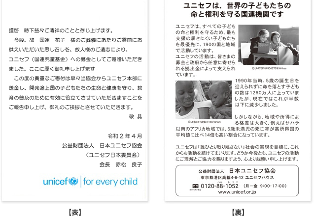 ※日本ユニセフ協会からご遺族様にお送りするときは、A4シート1枚にハガキ大のお礼状が4枚印刷されています。
