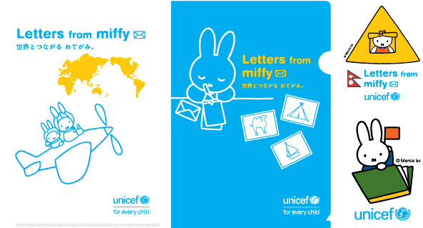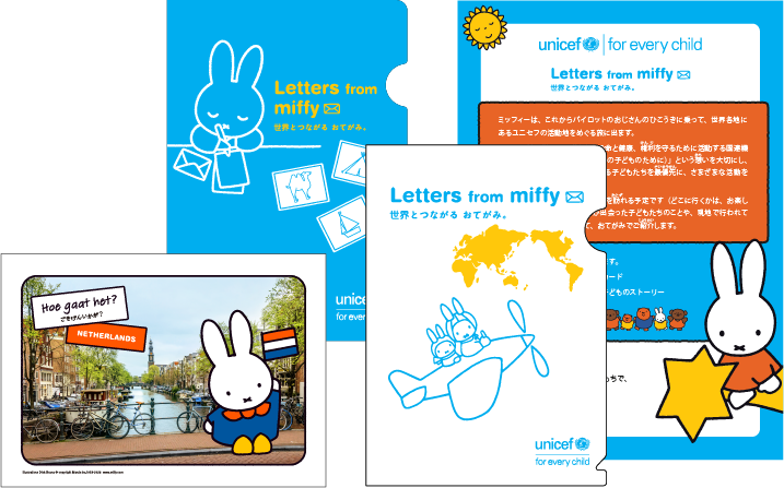 ミッフィーの作者であるディック・ブルーナさんは、誰かの助けが必要な人たちのために自分が描いたものが役立てたらうれしい、との思いから、これまで世界各国の社会活動に協力してこられました。世界の子どもたちのために行われているユニセフの活動に対しても、例えば、日本ユニセフ協会が過去に頒布していたユニセフ製品へのイラスト使用許可をいただいておりました。この度の「ユニセフ・マンスリーサポート・プログラム Letters from miffy」においても、世界の子どもたちへの支援の輪を広げるというプログラムの趣旨へのご賛同のもと、イラスト使用の許諾を受け、制作しております。