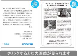支援者の方が、お祝いの「お返し」をユニセフに寄付くださった旨、お伝えいただくためのお礼状(葉書サイズ)です。