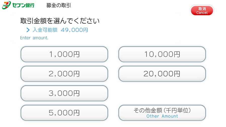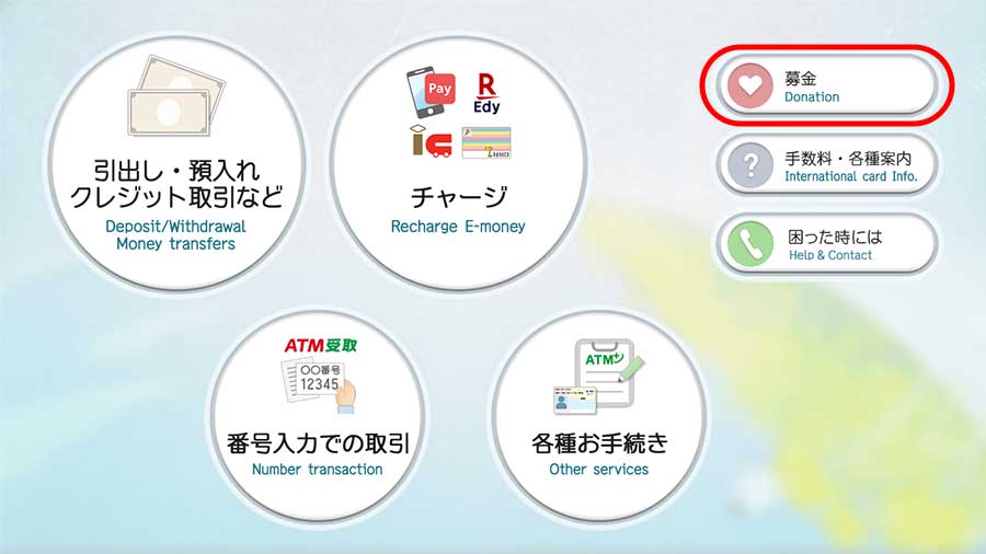 セブン銀行ATMのトップ画面の「募金」ボタンを押し、寄付先選択画面から「ユニセフ募金」を選択してください。