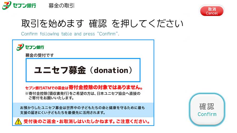 - セブン銀行ATMによるユニセフ募金は、ご寄付領収書は発行されません。