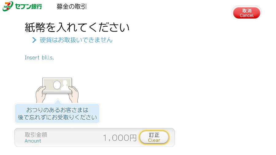 お札を入れてください。(ATMの紙幣入れが開きます)