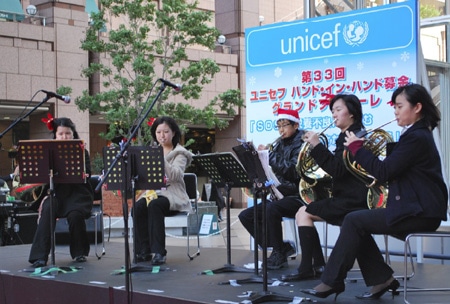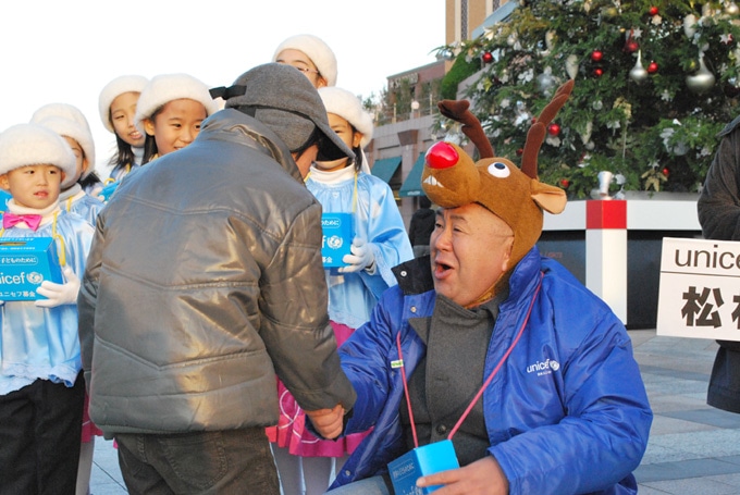 一斉活動日である12月23日(祝)には、恵比寿ガーデンプレイスと都内の主要駅で、30名以上の著名人と300名にのぼる子どもたち、そしてボランティアの皆さんが街頭に立ち、ユニセフ募金を呼びかけました。