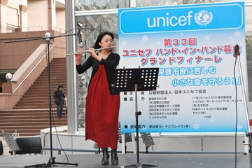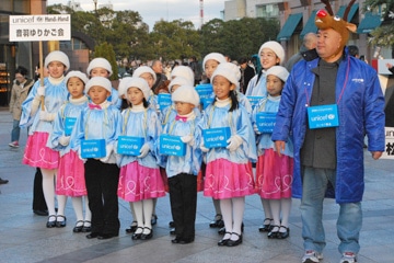 ユニセフサンタやガールスカウト、ボーイスカウト、そしてボランティアの皆さんの「世界の子どもたちのために!」「栄養不良に苦しむ子どものためにご協力ください!」「ユニセフ募金にご協力ください!」という、寒さに負けない元気な声が恵比寿ガーデンプレイスに響き渡りました。ほんの一部ですが、ご紹介いたします。