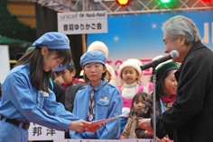 今年も大きな声で募金を呼びかけてくれたボーイスカウト、ガールスカウト、そして音羽ゆりかご会の子どもたちへのありがとうを! 日本ユニセフ協会専務理事 早水 研より感謝状を贈呈いたしました。