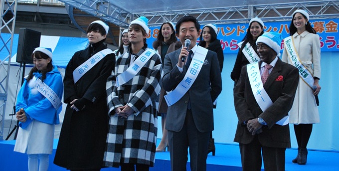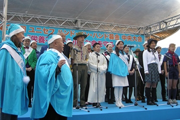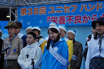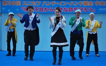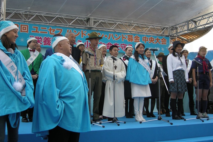 『ユニセフ ハンド・イン・ハンド募金キャンペーン』の中央大会が12月11日(日)に有楽町駅前広場にて開催されました。 午前11時から15時までの4時間にわたるイベントで、芸能界やスポーツ界からの著名人、ボーイスカウト・ガールスカウト、それに都内の小学校の子どもたちがボランティアとしてユニセフ募金を呼びかけました。