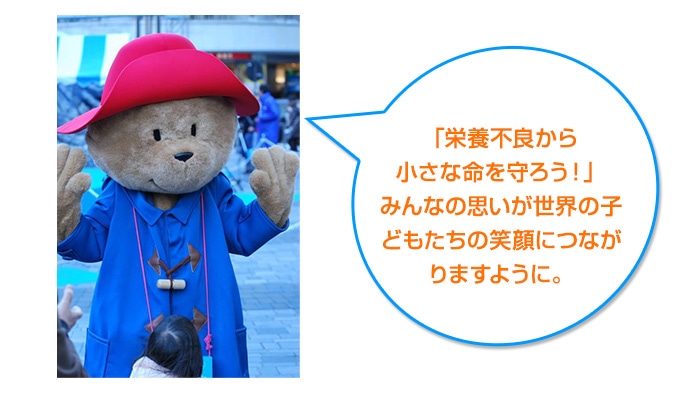 アグネス大使を始め、ボランティアゲストである各界の著名人の皆様がステージに登壇しました。生きるために欠かすことのできない栄養がとれないために、命を落とす子どもたちが大勢いること、世界では年間300万人の子どもたちが栄養不良で命を落としていること、幼い命を守るためには、世界の子どもたちの栄養状況を一日も早く改善する必要があることなどを、訴えました。