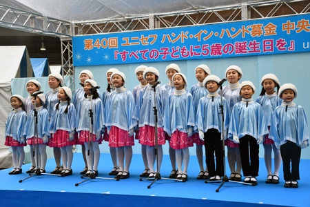 「世界の子どもたちのために、ユニセフ募金にご協力ください!」寒さに負けない元気な声が有楽町駅前広場に響き渡りました。
