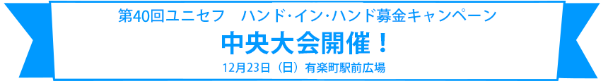 『ユニセフ ハンド・イン・ハンド募金キャンペーン』の中央大会が12月23日(日)に有楽町駅前広場及び有楽町駅地下広場にて開催されました。午後12時から15時までの3時間にわたるイベントで、芸能界やスポーツ界からの著名人、ボーイスカウト・ガールスカウト等の子どもたちがボランティアとしてユニセフ募金を呼びかけました。