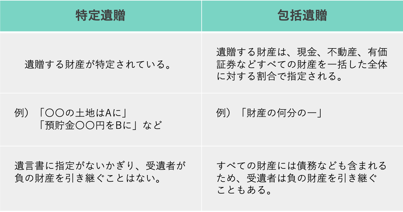 遺贈には、2種類の寄付方法があります。特定遺贈では渡す財産を特定するのに対し、包括遺贈では全財産に対する割合で指定するのが、それぞれの大きな特徴です。また、包括遺贈では、財産を受け取る受遺者は相続人と同等の権利、及び義務を負うため、債務を含めた財産の相続になります。