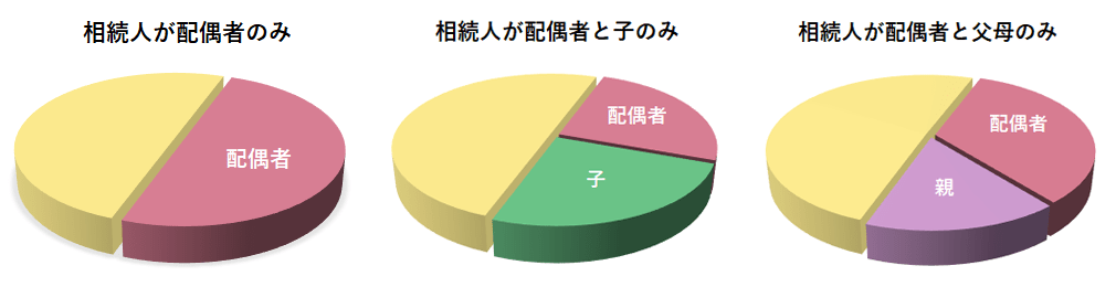 図のように「相続人が配偶者と子のみ」の場合は、遺留分は1/2、法定相続分が配偶者、子どもに1/2ずつなので、各自の遺留分は1/2×1/2=1/4となります。「相続人が父母のみ」の場合は、遺留分が1/3、「相続人が配偶者と父母のみ」の場合では遺留分1/2のなかで、配偶者2/3、親1/3と分けられることになります。