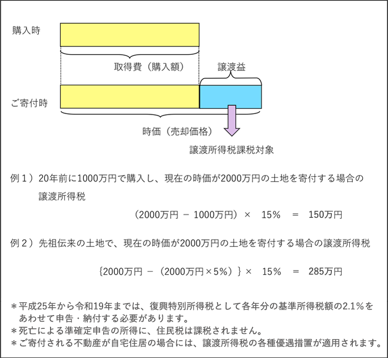 法人への不動産の遺贈では、譲渡益が発生する場合は譲渡所得税が課せられるため、準確定申告(相続開始を知った日から4カ月以内)で申告しなければなりません。これは、法人への不動産の遺贈は「無償の譲渡」ですが、税法上は「時価で売却したものとみなされる」ためです。