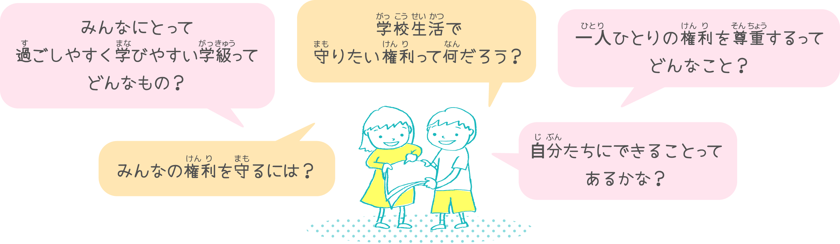 「⼦どもの権利条約」にはどんな権利が定められているのか、見てみよう。そして、自分たちの学校生活とのつながりを考えよう。