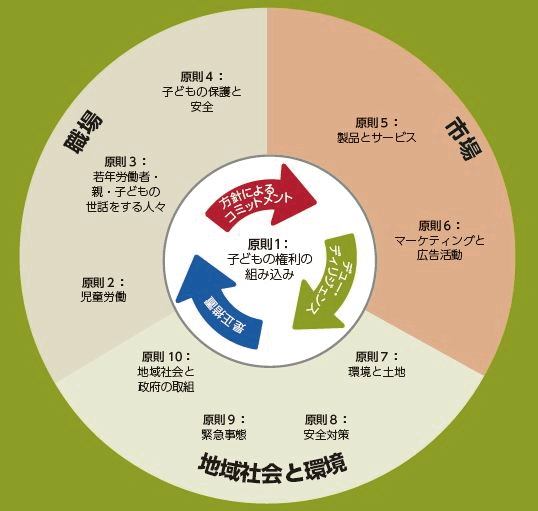 「子どもの権利とビジネス原則」は、子どもの権利を尊重し推進するための企業のアクションを提示するものです。子どもの権利を尊重することは、企業への最低限の要求事項です。一方、子どもの権利を推進することは、要求まではされないとしても、強く奨励される行動です。「原則」の一つひとつは、子どもの権利を尊重し推進するためのアクションについて説明しています。