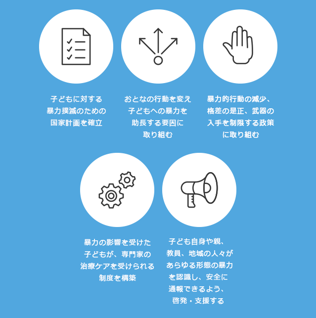 また、2016年には、パートナー団体とともに「子どもに対する暴力撲滅のためのグローバル・パートナーシップ(GPeVAC)」を立ち上げました。このパートナーシップは、各国政府、国連機関、民間セクター、市民社会、研究者、若者たちが、2030年までに子どもへの暴力を撲滅するという、持続可能な開発目標(SDGs)に掲げられた、国際社会の新たなターゲット達成のために協力する取り組みです。