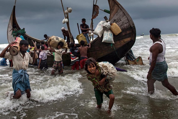 ミャンマーからボートに乗ってバングラデシュに逃れてきた、ロヒンギャの子どもと家族。