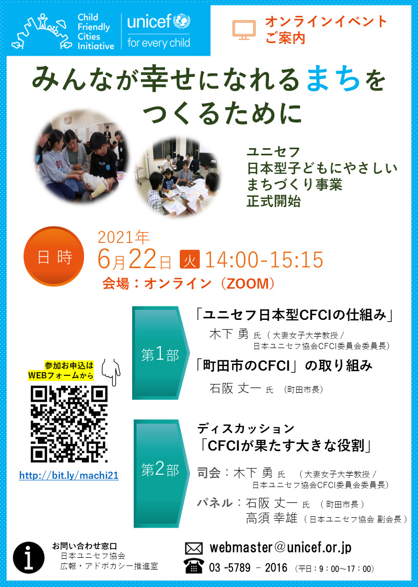 公益財団法人日本ユニセフ協会(東京都港区/会長:赤松良子)は、ユニセフ「日本型子どもにやさしいまちづくり事業」正式開始発表にともない、2021年6月22日(火)14:00~15:15、オンラインイベント『「みんなが幸せになれるまち」をつくるために』を開催いたします。