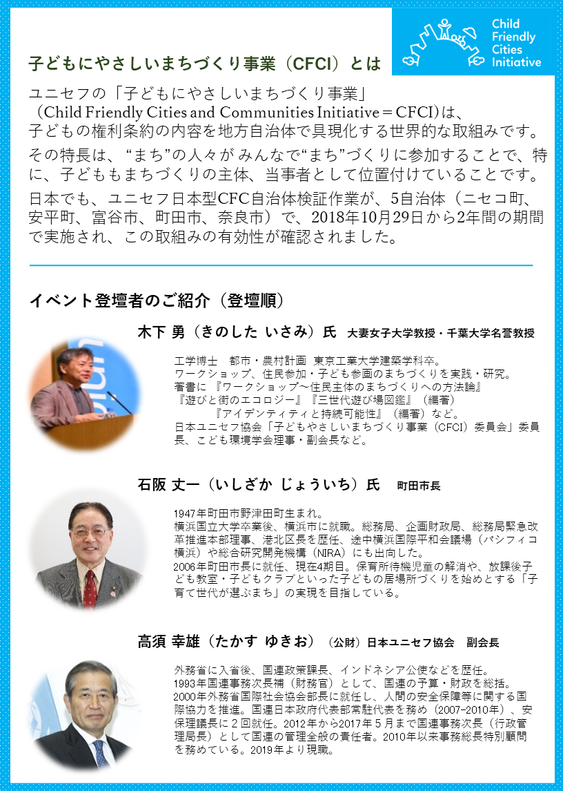 ユニセフ「子どもにやさしいまちづくり事業(CFCI)」とは、子どもと最も身近な行政単位である市町村等で、子どもの権利条約を具現化する活動です。その特長は、市町村の“まち”の人々がみんなでみんなの“まち”を作っていくこと、とりわけ、子どももまちづくりの主体、当事者として位置付けていることです。