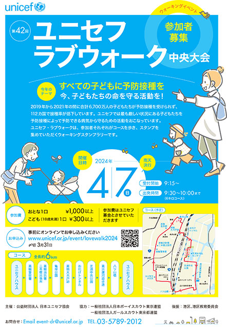 | テーマ | すべての子どもに予防接種を~今、子どもたちの命を守る活動を!~ 2019年から2021年の間に合計6,700万人の子どもたちが予防接種を受けられず、112カ国で接種率が低下しています。また、コロナ禍の直前または最中に生まれた子どもたちは、通常であれば既に予防接種を受ける年齢を過ぎており、栄養不良から免疫力が低下して予防接種が受けられないと子どもがかかりやすい病気が命取りになってしまいます。ユニセフではそうした子どもたちに予防接種を行い、最も厳しい状況にある子どもたちを予防できる病気から守るための活動を行っています。今回のラブウォークの参加費は、ユニセフが世界各地で実施している保健、栄養、水と衛生、教育への支援など、子どもたちの命と未来を守る活動に活用されます。 |