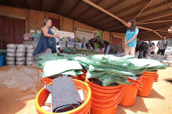 ニアメにある、ユニセフの緊急物資保管倉庫。(洋服用の)布、蚊帳、衛生キット、石鹸、テントとロープ、やかんなど生活に必要な26種類の物資を用意。一週間に約1,000袋(1,000世帯分)を詰めて発送する。